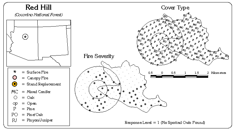 The Red Hill territory (MT #040224) is located on the Coconino National Forest southwest of Flagstaff, AZ. The original territory size is 305 hectares (753 acres) and the addition of our 1-km radius circle increased our survey area to 552 ha (1,365 ac). The original territory ranges in elevation from 1,945 - 2,224 meters (6,381 - 7,297 feet) and has a fairly equal distribution of north-, east-, south- and west-facing slopes. The average slope over the territory is 14.6 . The Red Hill territory was paired with the unburned Bunker Hill territory located approximately 7 kilometers to the south. Along with the Upper West Fork territory, the Red Hill territory was burned by the Hog/Red Hill Prescribed Fire in 1994 (Peaks 1996). Red Hill was also burned fairly severely in 1988 during another phase of the same Red Hill Prescribed Fire project, before the Forest Service was aware that there were spotted owls in the area (Peaks 1990). We had 88 habitat survey points within this original territory boundary and 72% of these showed no evidence of recent fire. 28% showed only evidence of ground fire and no points showed any sign of canopy or complete stand-replacement burn. 0% of the survey points were inaccessible or otherwise not surveyed. Prior to the fire, 50% of the territory had a Pine cover type, 40% had a mixture of Pine and Oak, and 6% had a Mixed-Conifer cover type. 5% was classified as "Other".